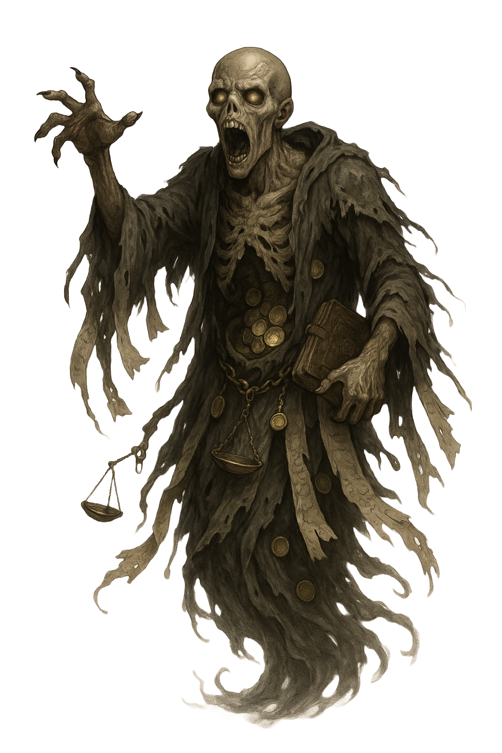 These wraiths are twisting silhouettes of ledger lines and hollowed eyes, fingers curled