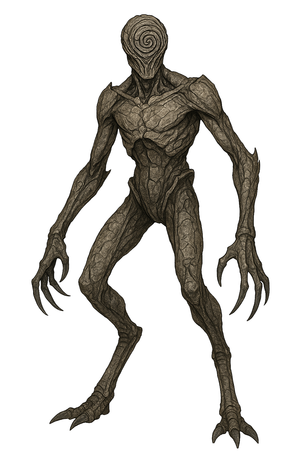 a collective of monstrous forms. Their bodies are entirely encased in a rock-like chitin, seamless